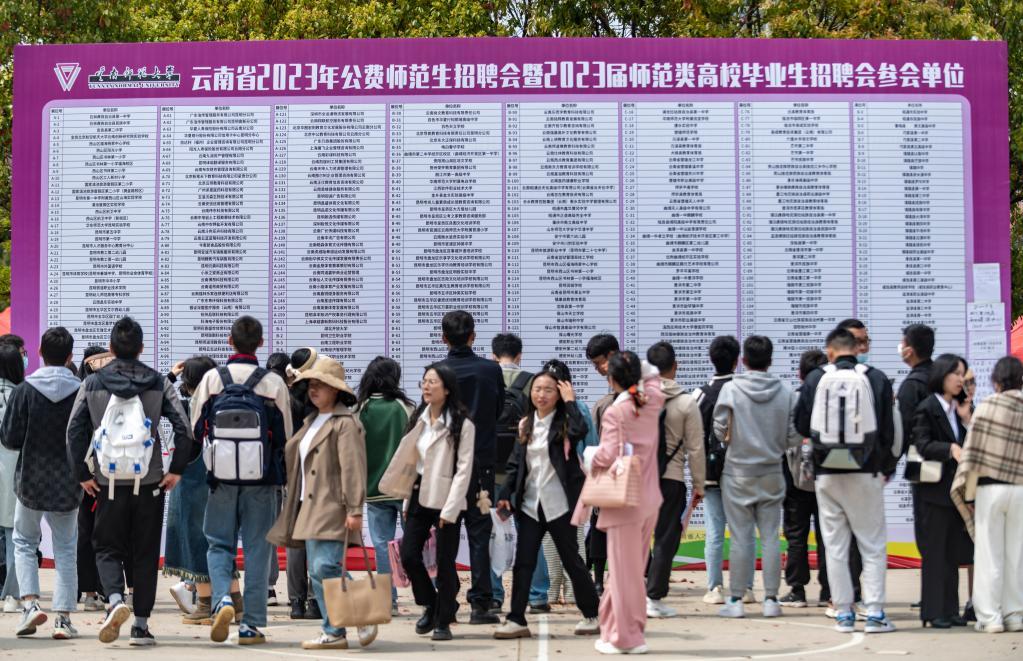 云南省2023年公费师范生招聘会暨2023届师范类高校毕业生招聘会,日前在云南师范大学呈贡主校区举行。这是近3年来云南最大规模师范类高校毕业生线下招聘会,吸引了云南、北京、广东等14个省(区、市)的516家单位参加,提供就业岗位1.5万余个。