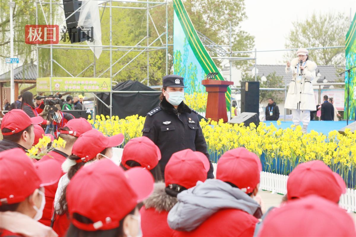 在油菜花海周边道路,极目新闻记者看到执勤民辅警紧盯高峰时段、重点路段,对景区的人流、车流进行快速疏导,指挥游客车辆有序停放。在张池农耕文化体验园景区演出舞台、赏花步游道、观景亭、特色农产品和小吃展销区等重点部位,执勤民辅警开展多时段交错巡逻,及时为有需要的游客提供服务、解决困难。