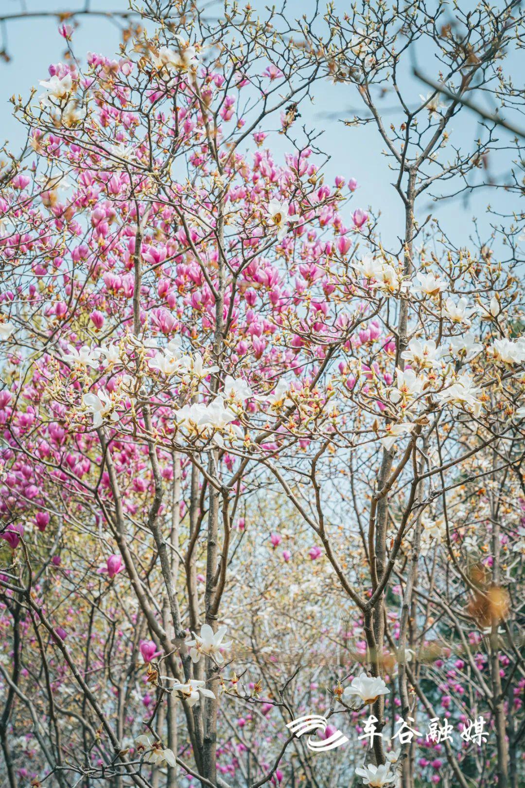 一入汤湖公园,先惊艳眼睛的不是郁金香,是玉兰花。粉白相间的玉兰花悬于树枝上,层层叠叠,像是在欢迎人们。