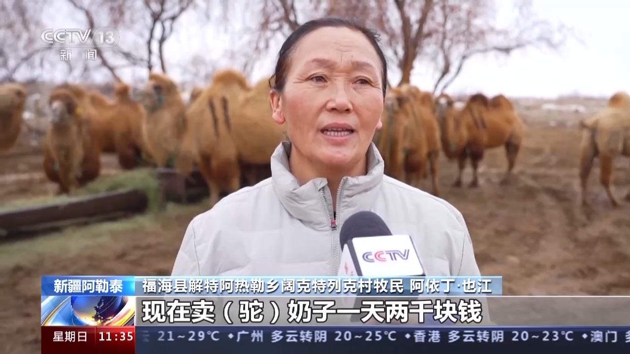 新疆福海县解特阿热勒乡阔克特列克村牧民 阿依丁·也江:现在卖驼奶子一天两千块钱,一年挣五六十万。