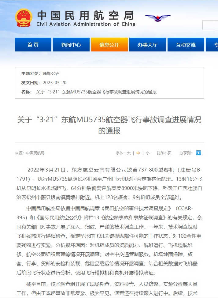 2022年3月21日,东方航空云南有限公司波音737-800型客机(注册号B-1791),执行MU5735昆明长水机场至广州白云机场国内定期客运航班。13时16分飞机从昆明长水机场起飞,64分钟后偏离巡航高度8900米快速下降,坠毁于广西壮族自治区梧州市藤县埌南镇莫埌村附近。机上123名旅客、9名机组成员全部遇难。