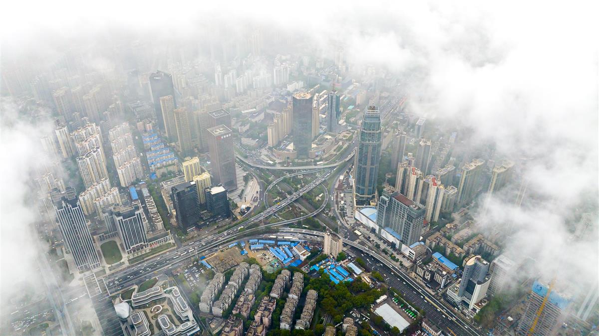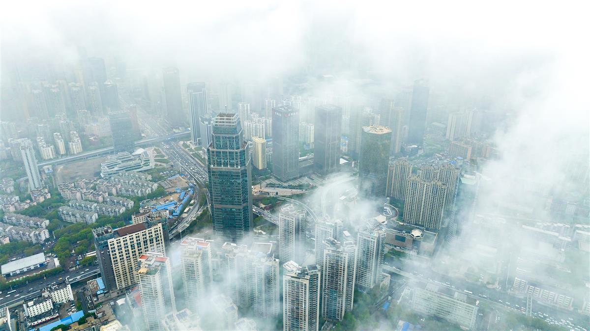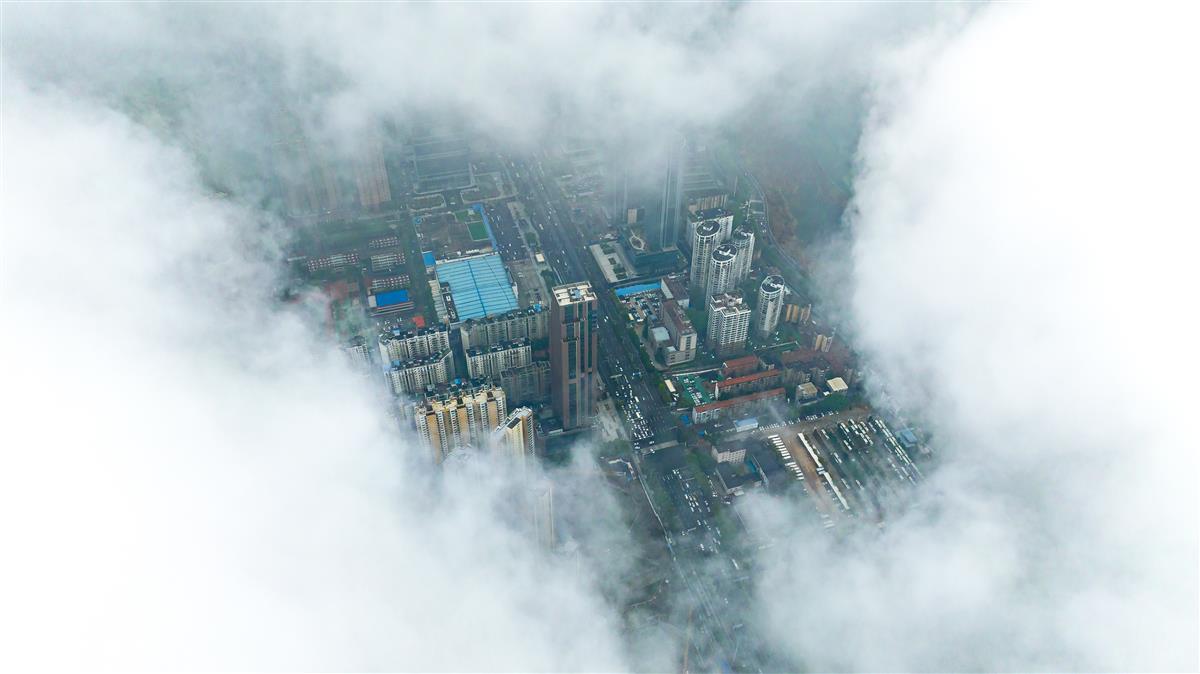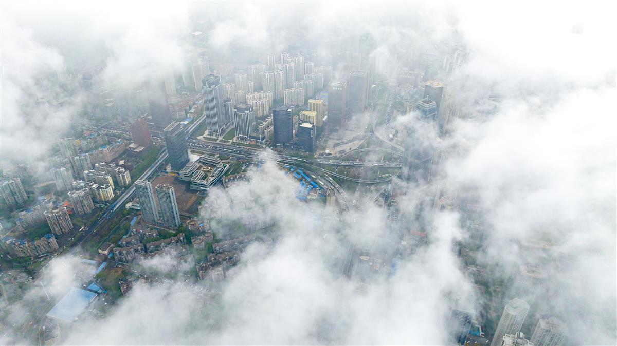 3月20日清晨,航拍云雾缭绕的武汉城区。近日,受低温阴雨天气影响,武汉城区出现云雾景象。雾景似“海浪”在楼宇间漫舞、流淌,形成半城烟云半城“海”的奇妙景观。(湖北日报全媒记者柯皓 摄)