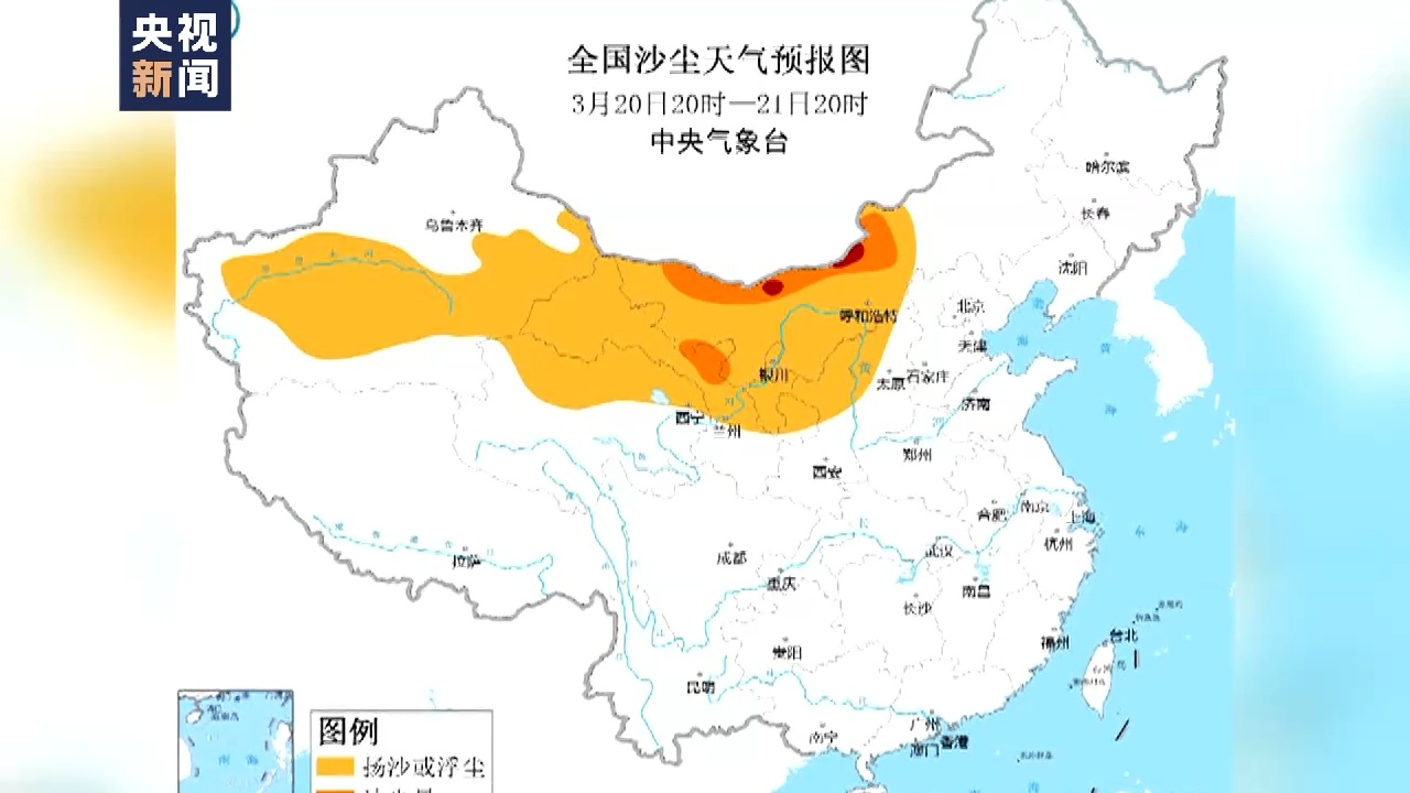 中央气象台3月20日18时发布大风降温预报,并继续发布沙尘暴蓝色预警。受冷空气大风影响,预计3月20日20时至21日20时,新疆南部和东部、青海北部、甘肃中西部、内蒙古中西部、宁夏、陕西北部、山西西部等地的部分地区有扬沙或浮尘天气,其中,内蒙古中西部的偏北地区、甘肃西部等地的部分地区有沙尘暴,局地有强沙尘暴。