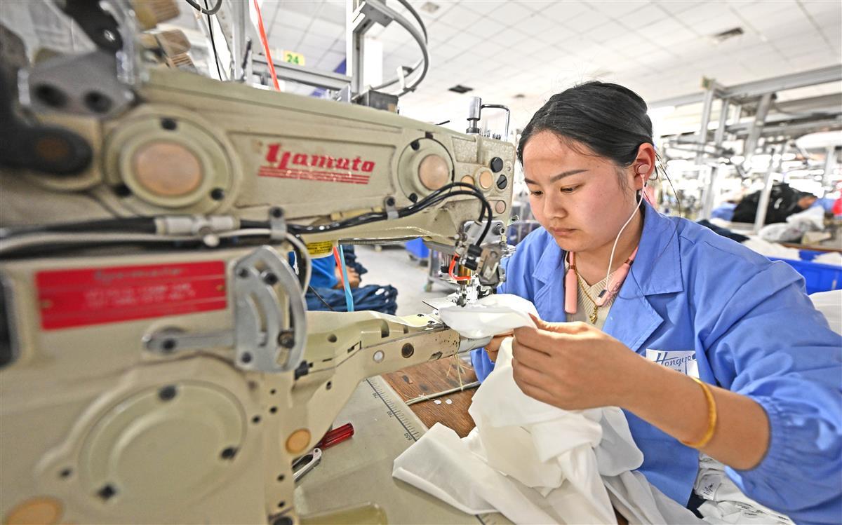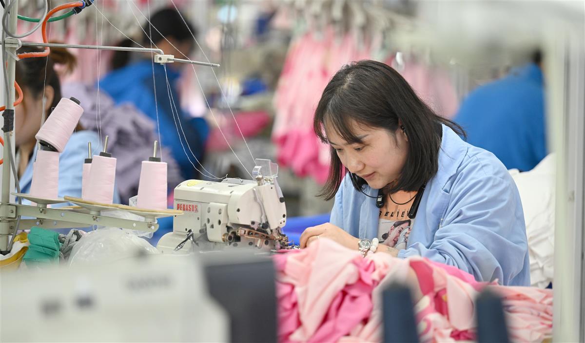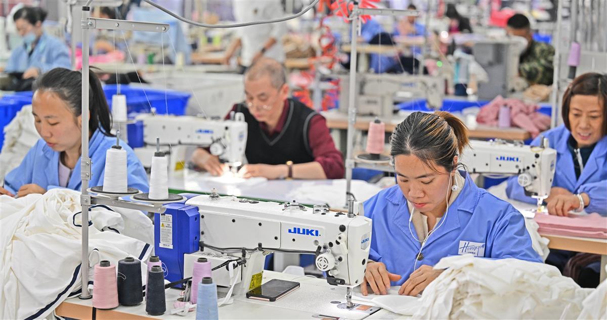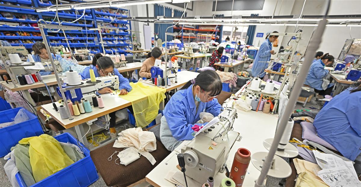 3月13日,荆州市沙市区岑河镇一家童装企业内,车工们在生产线上赶制电商平台订制的婴童装。