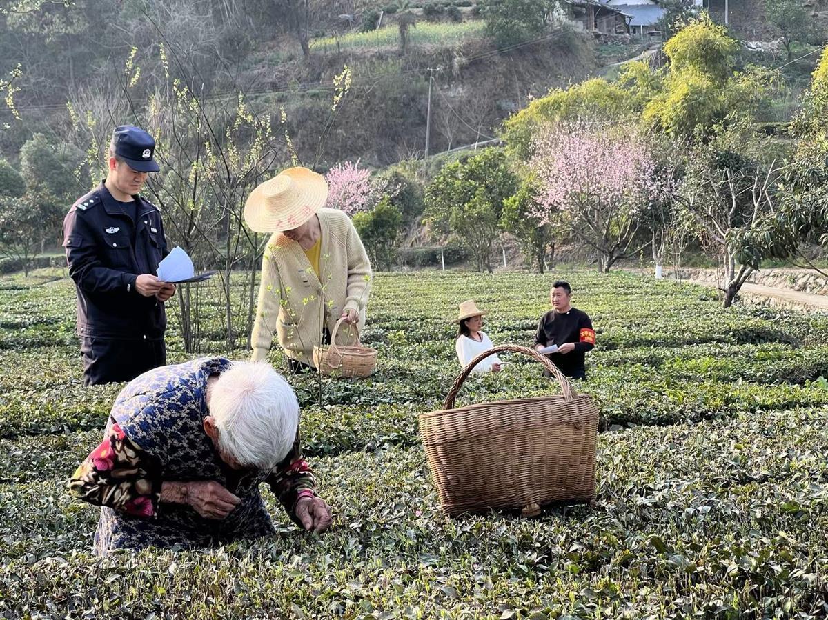 湖北宜昌夷陵区太平溪镇是湖北早市茶之乡,现有茶园40000亩,其中早市茶面积已达2000亩。全镇70%的人是茶农,70%的产业是茶产业,70%的收入来源于茶叶,“明前茶,贵如金”,春茶开园,为了抢抓收入,茶农早出晚归,大笔现金存放在家里,带来安全隐患。太平溪派出所从群众利益出发,联合村警(辅)、网格员、治安积极分子、老党员、退休教师等80余人,以村为单位组建13支“太平反诈”志愿宣讲小分队,走进田间地头、茶叶交易市场等地送上防盗、反诈、防火等安全大礼包,绷紧茶农安全弦。
