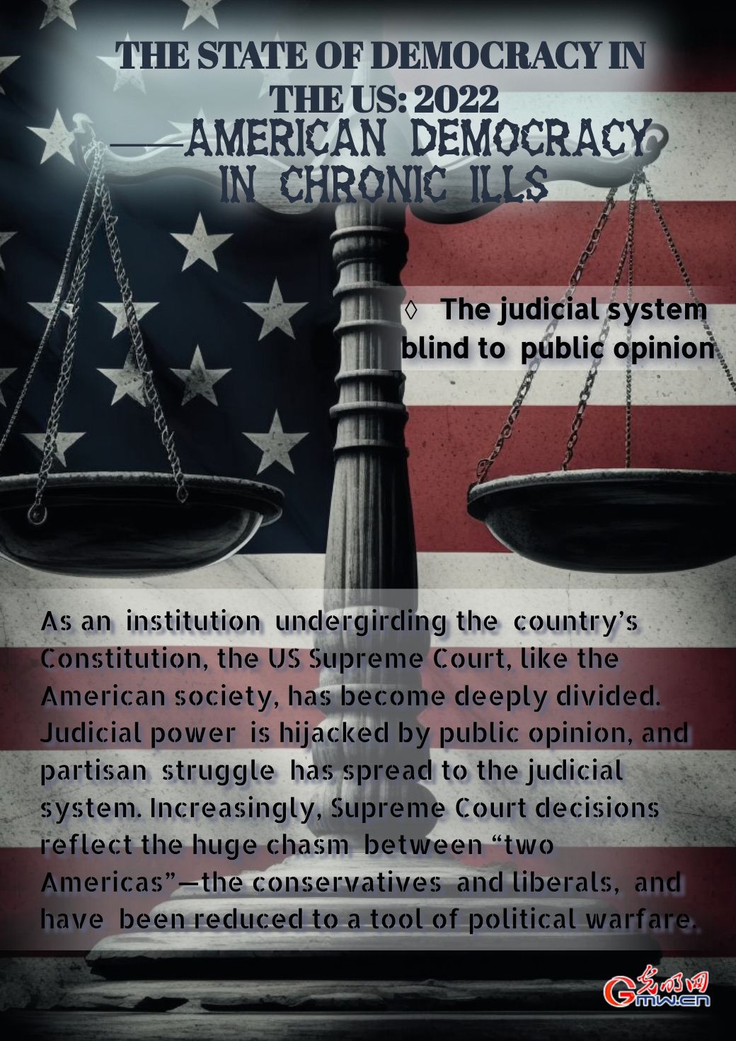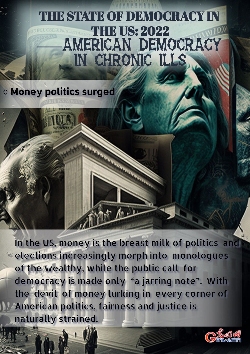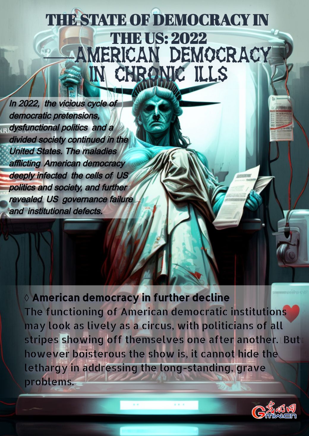 In 2022, the vicious cycle of democratic pretensions, dysfunctional politics and a divided society continued in the United States. Problems such as money politics, identity politics, social rifts, and the gulf between the rich and poor worsened. The maladies afflicting American democracy deeply infected the cells of US politics and society, and further revealed US governance failure and institutional defects.