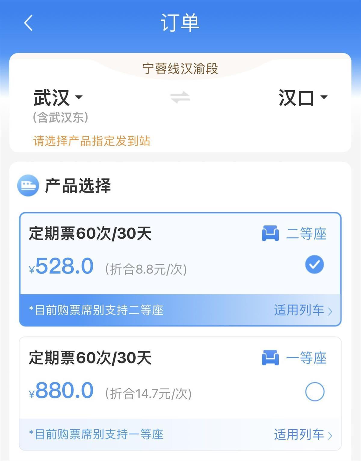 极目新闻记者通过铁路12306APP查询发现,这条线路恰好途经武汉的武汉、汉口两站。武汉站到汉口站如果购买60次/30天的定期票,二等座价格为528元,折合8.8元/次。一等座880元,折合14.7元/次。
