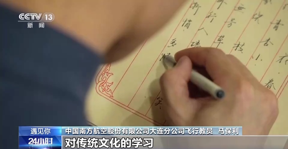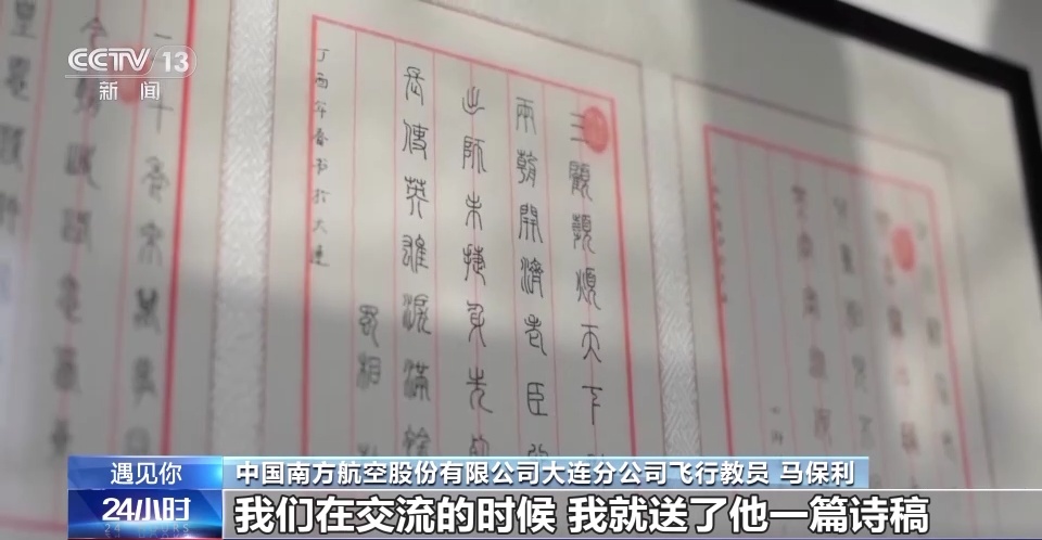 中国南方航空股份有限公司大连分公司飞行教员 马保利:我在执飞航班任务的时候,碰到了一位来自伦敦的国际民航组织的一个检查员,我们在交流的时候,我就送了他一篇诗稿,我用篆书写的王昌龄的出塞,他就很感慨,他感慨就是中国两千多年前的文字,这么美,而且(篆书诗稿)出自一个当代的、驾驶着先进科技飞机的一个机长的手里。这件事情之后也让我有所思考,作为一个中国人,如果有机会的话,我想跟更多的国际友人,去分享我们中国文字,中国诗词,包括中华优秀传统文化的故事。