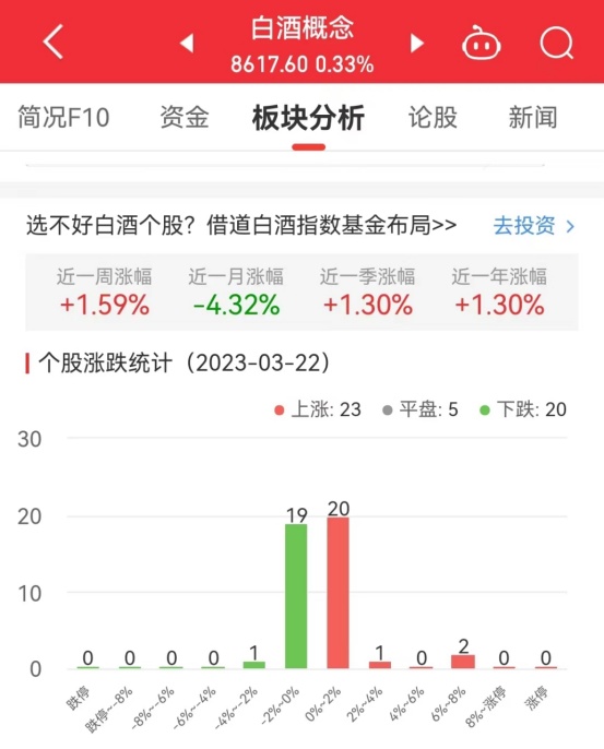中国经济网北京3月22日讯 今日,白酒概念板块整体涨幅0.33%,其中23只股票上涨,5只股票平盘,20只股票下跌。