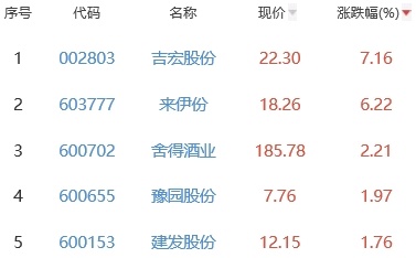 其中,吉宏股份、来伊份、舍得酒业、豫园股份、建发股份位列板块涨幅前五位,涨幅分别为7.16%、6.22%、2.21%、1.97%、1.76%。