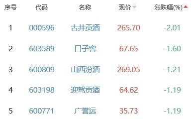 古井贡酒、口子窖、山西汾酒、迎驾贡酒、广誉远位列涨幅榜后五位,涨幅分别为-2.01%、-1.60%、-1.21%、-1.19%、-1.19%。