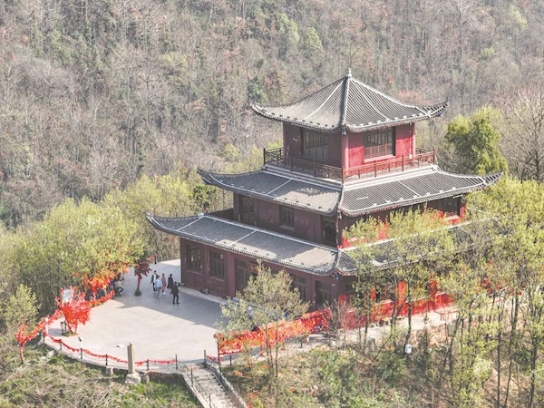 从山下仰望,万木峥嵘,苍翠欲滴,山峰上隐约出现一座红色的亭台,宛如一颗红宝石镶嵌在山尖;从山上俯瞰,层峦耸翠,襟江带湖,山脚下错落着村庄和田地,一望无际的江汉平原尽收眼底。