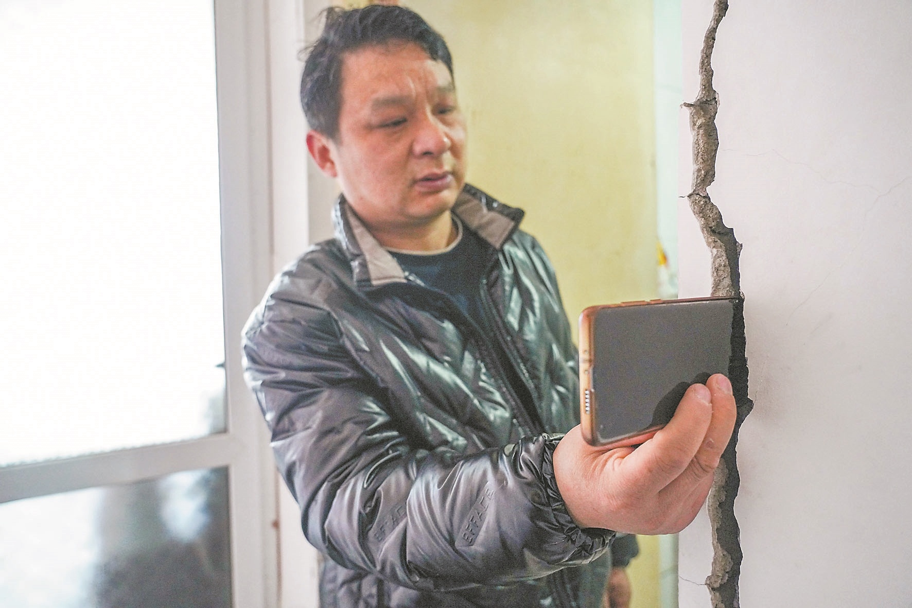 在何先生房内,客厅、卧室、厨房、卫生间等多处出现裂缝,有的裂开了较大的口子,墙体裂缝甚至可以插入手机。