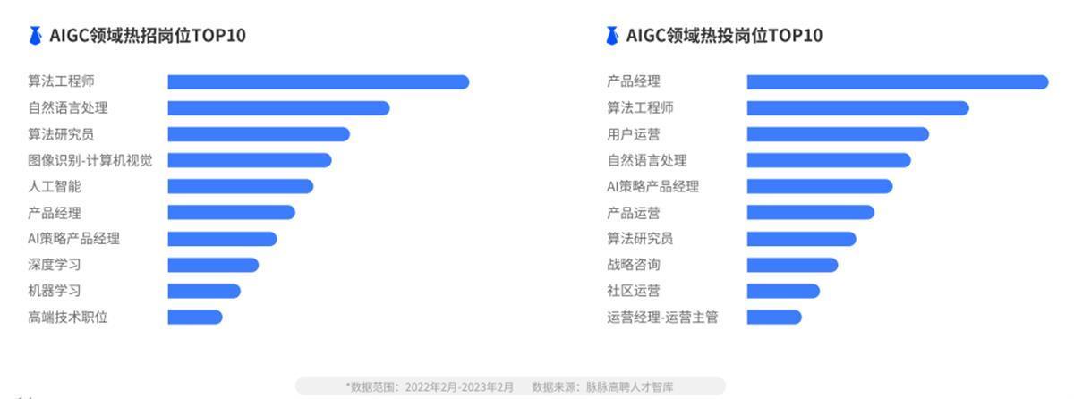 但AIGC人才的供需结构存在失衡现象。在需求端,AIGC领域热招岗位以技术岗位为主,算法工程师、自然语言处理、图像识别等研发人才需求旺盛。而在供给端,AIGC领域热投岗位则以AI产品经理类、运营类等非技术岗位居多。