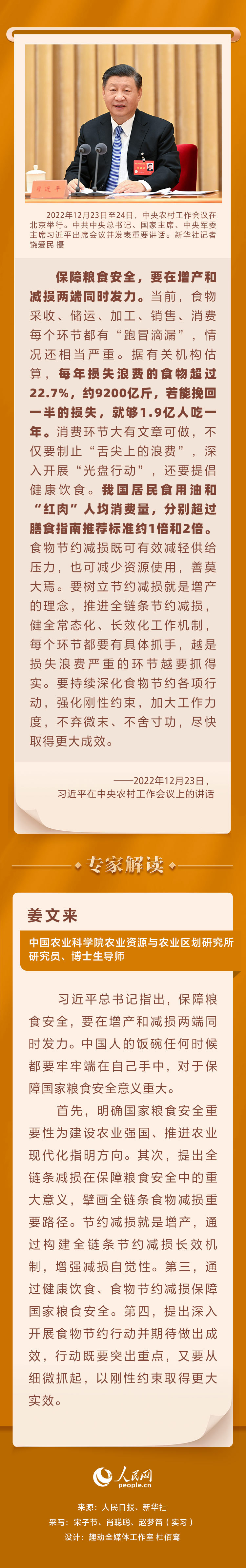 3月16日出版的第6期《求是》杂志发表中共中央总书记、国家主席、中央军委主席习近平的重要文章《加快建设农业强国 推进农业农村现代化》。讲话指出“保障粮食安全,要在增产和减损两端同时发力”。人民网邀请专家进行解读。