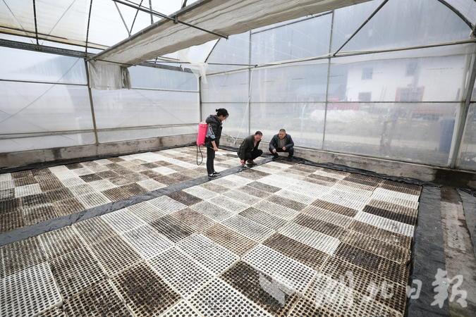 苗好一年收,育苗是烤烟生产的第一步。在大支坪镇堰塘坪旁的耀英坪村,一排排烟叶育苗大棚在春日暖阳下,闪烁着银白色的光芒,大棚内,育苗专业户周先彩一边用喷雾器洒水,一边蹲在地上查看大棚内的温湿度情况。