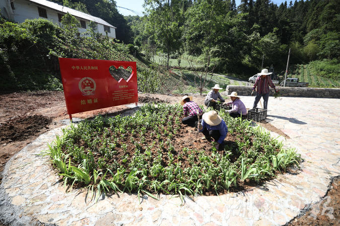 “通过深入走访和挖掘,我在十二岭村发现了严若兵等6对结婚时间较长的恩爱夫妻,于是,把他们的爱情故事记录下来,收集他们结婚时和现在的照片。”叶成介绍,通过征集镇村干部群众的意见和建议,他在十二岭村231省道旁的一块空地建设了一个“爱情小广场”,引领乡风文明。