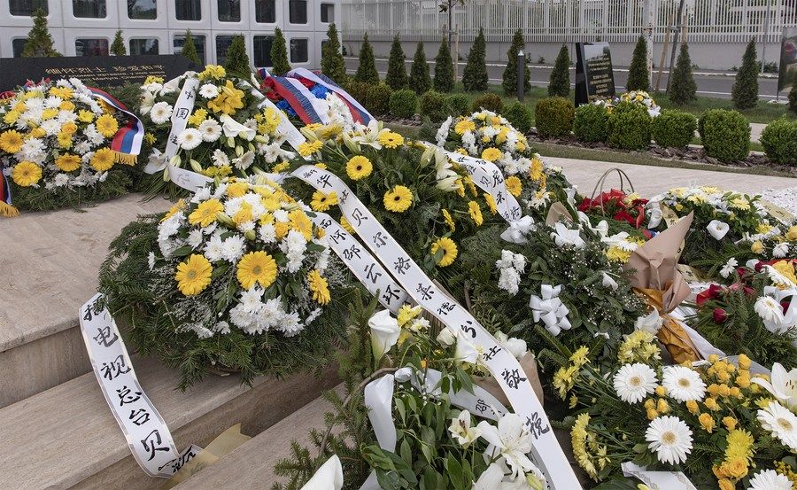 Wreaths are seen at memorial plaques dedicated to the three Chinese journalists killed in the NATO bombing of the former Chinese embassy in the Federal Republic of Yugoslavia in 1999, in Belgrade, Serbia, May 7, 2022. (Photo by Wang Wei/Xinhua)