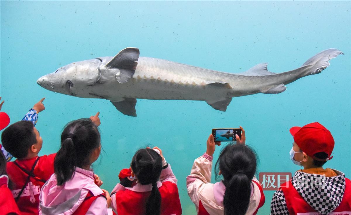 2021年10月16日,湖北荆州,参加科普活动的小学生在中国水产科学研究院长江水产研究所太湖试验场内了解中华鲟