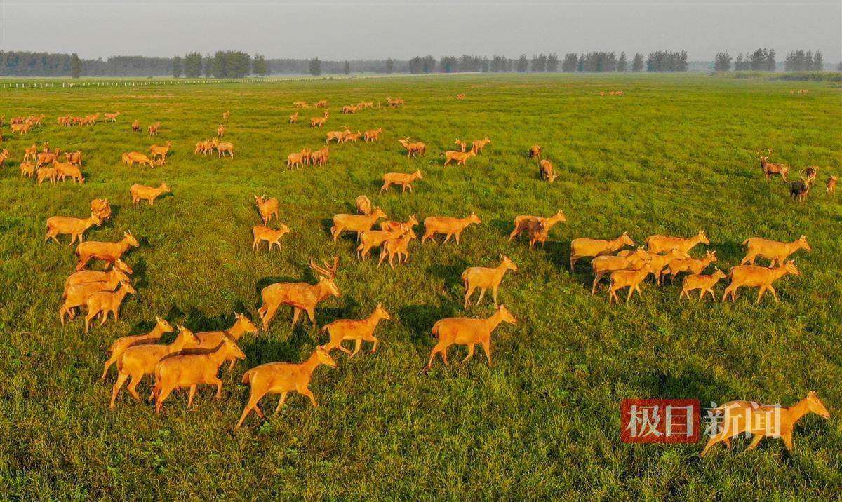 2018年7月20日,石首麋鹿国家级自然保护区内,麋鹿在悠闲觅食