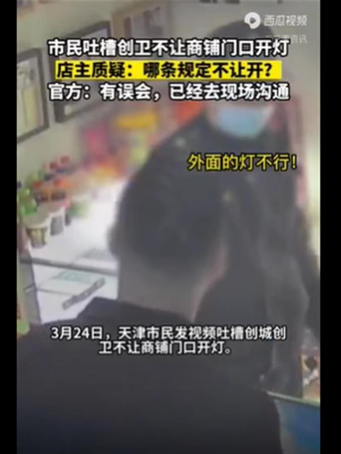 3月24日,天津市民发视频吐槽创城创卫不让商铺门口开灯。店主称,最近市里创城创卫,结果自己店里被要求不许开门口的灯。“只是照明灯,照地上的”,自己不懂这是为什么。