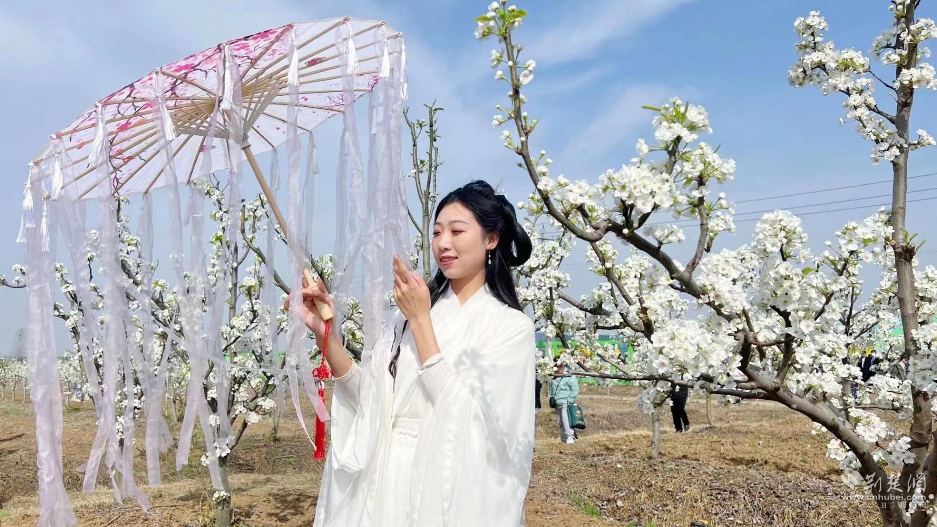 游客身着古装赏梨花。通讯员供图