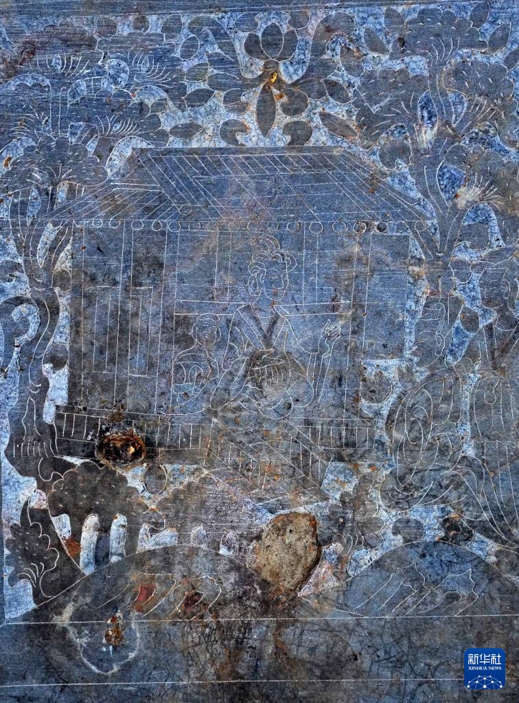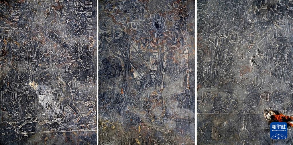 这是围屏石棺床石屏风上的图像(3月15日摄)。