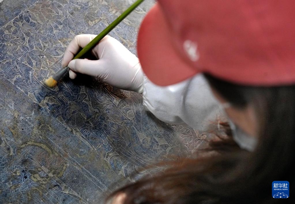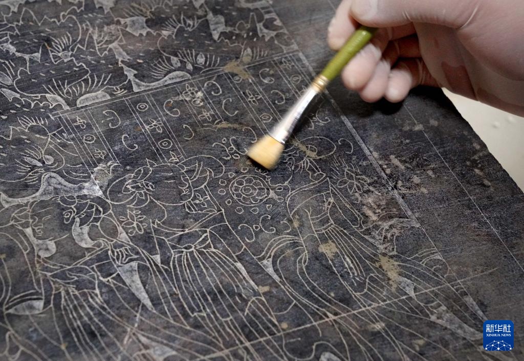 工作人员在清理围屏石棺床石屏风上的图像(3月15日摄)。
