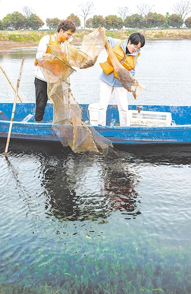 3月11日,女博士后张秀梅(图右)在清澈的湖面上查看小龙虾和水草的长势。