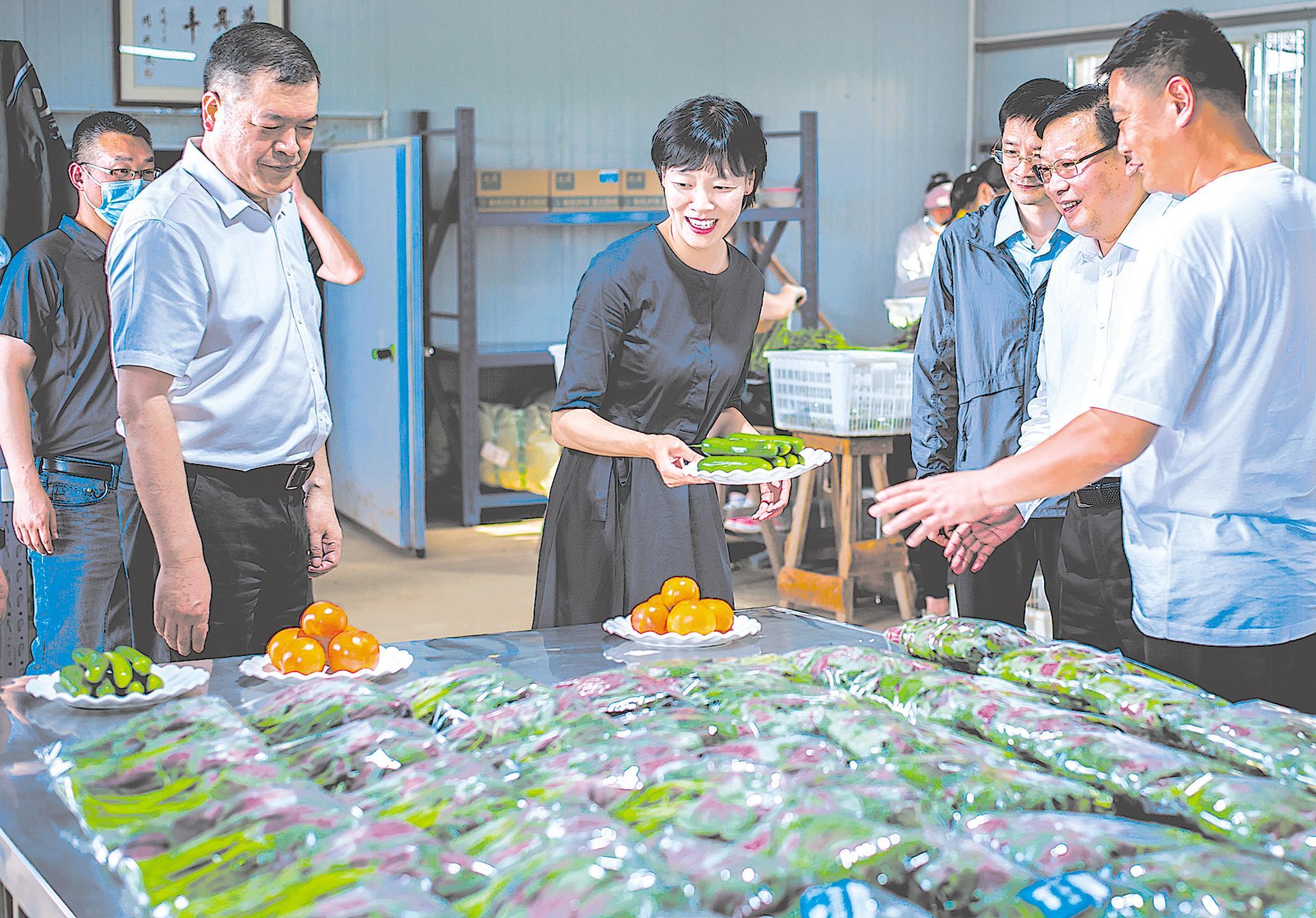 2022年6月8日,海归女博士岳文雯(女,图中)展示她种植的有机蔬菜。她的有机蔬菜种植基地已成为武汉模范单位,常常有人来学习调研。