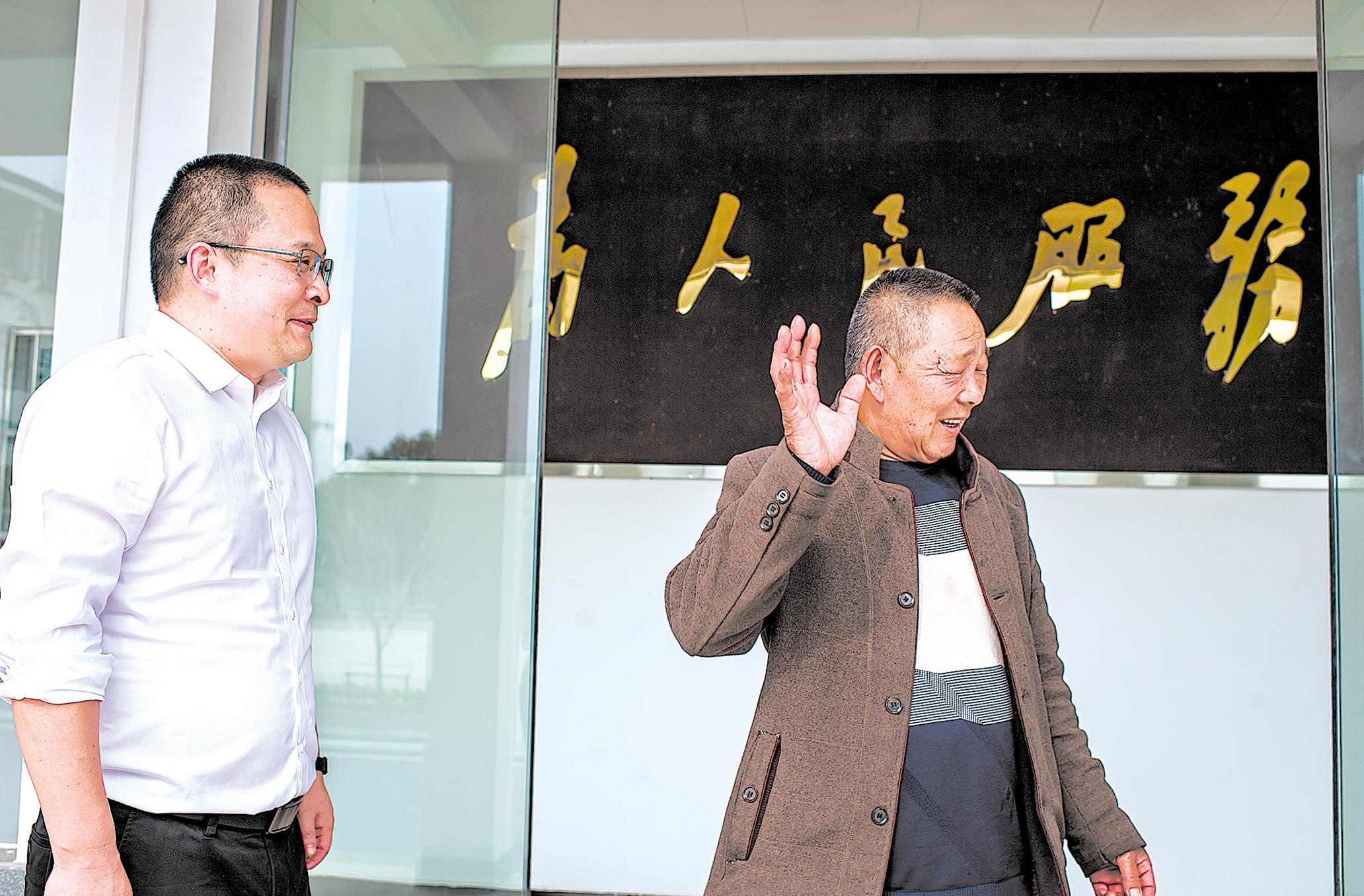 3月10日,武汉黄陂区朱铺村支部书记朱俊刚(图左)把办完事的村民送出门,他的微笑服务让村民满意而归。