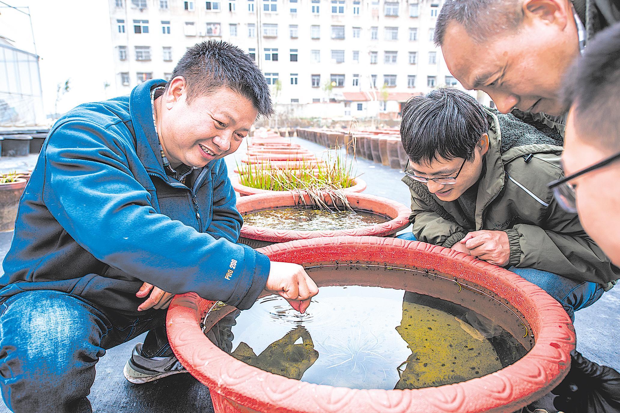 3月9日,肖克炎(左一)在他创建的珍稀水生植物资源圃里,向游客介绍国家一级重点保护野生植物——中华水韭。