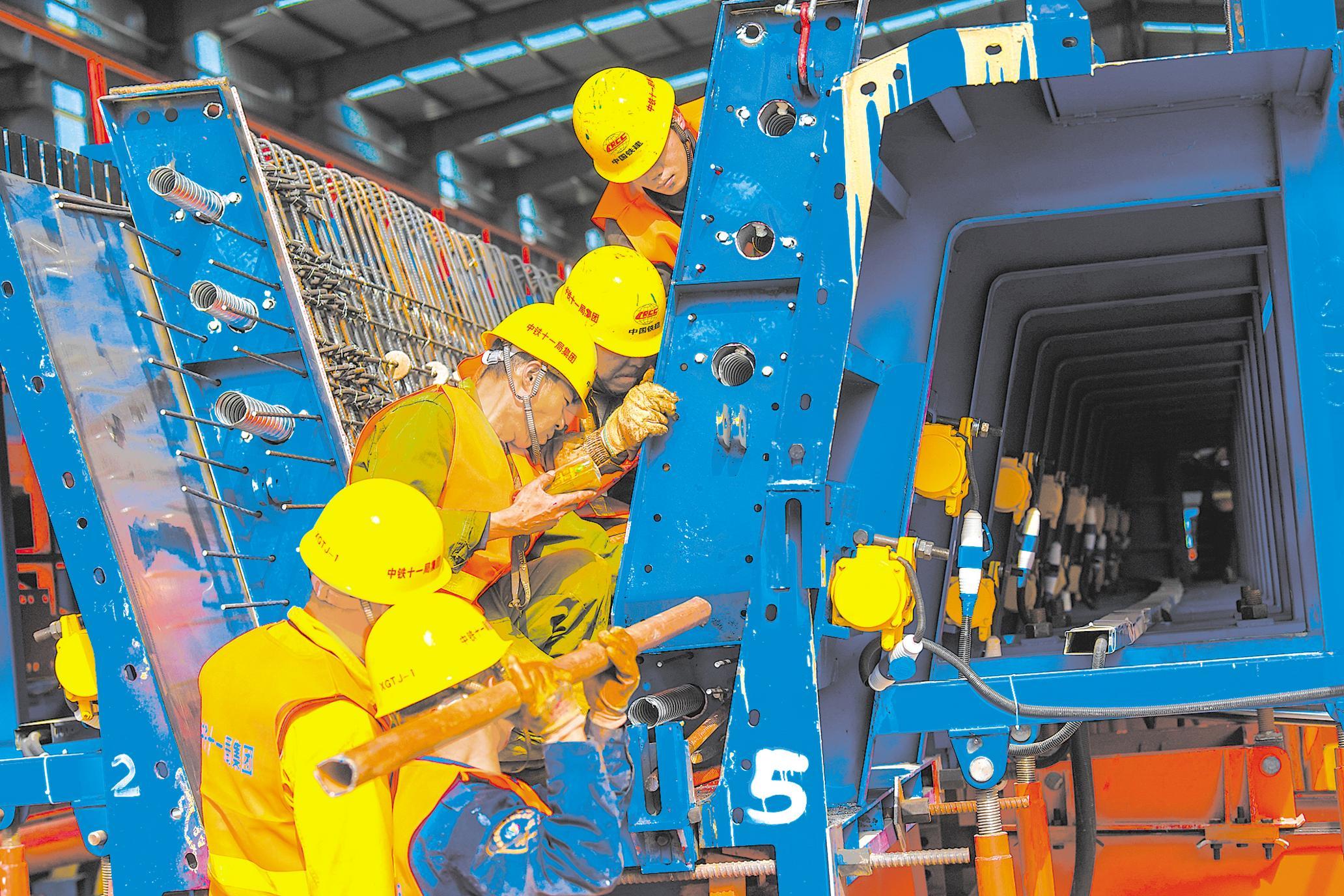 3月27日,中铁十一局双柳长江大桥项目1号制梁场,随着首片预制箱梁浇筑完成,该大桥建设进入新阶段。新港高速公路双柳长江大桥及接线工程对于优化武汉都市圈环线路网具有重要意义。全线首座“现代化智慧型预制梁场”位于武汉市新洲区,承担了2483片预制箱梁生产任务,布置有6条环形制梁生产线。 (湖北日报全媒记者 田悦 通讯员 金伟 刘若梅 摄)