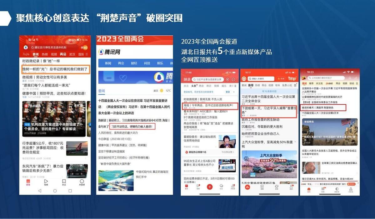 “火了!火了!咱们的新媒体产品被全网置顶啦!”3月4日晚,湖北日报一件新媒体作品《奋进的春天丨满庭芳 荆楚绝色》,被今日头条、新浪、搜狐、凤凰网、腾讯新闻等各大新闻客户端和网站置顶推荐。2023年全国两会期间,湖北日报5件作品全网置顶,推动湖北日报两会全媒报道全网总阅读量达到18.85亿的高峰。