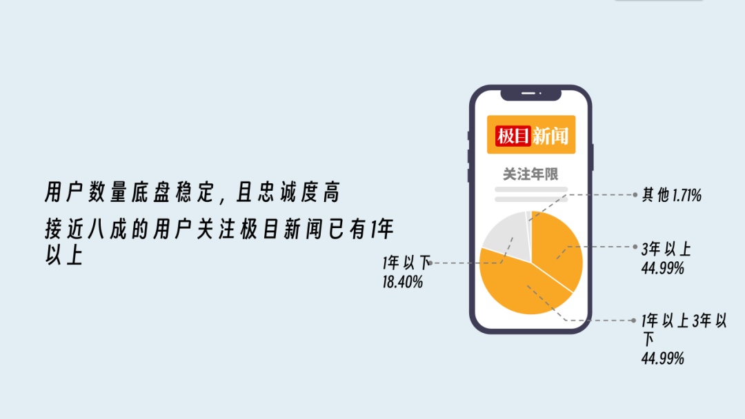 咱们极目新闻的用户数量不断增长,且忠诚度高。接近八成的用户关注极目新闻已有1年以上。