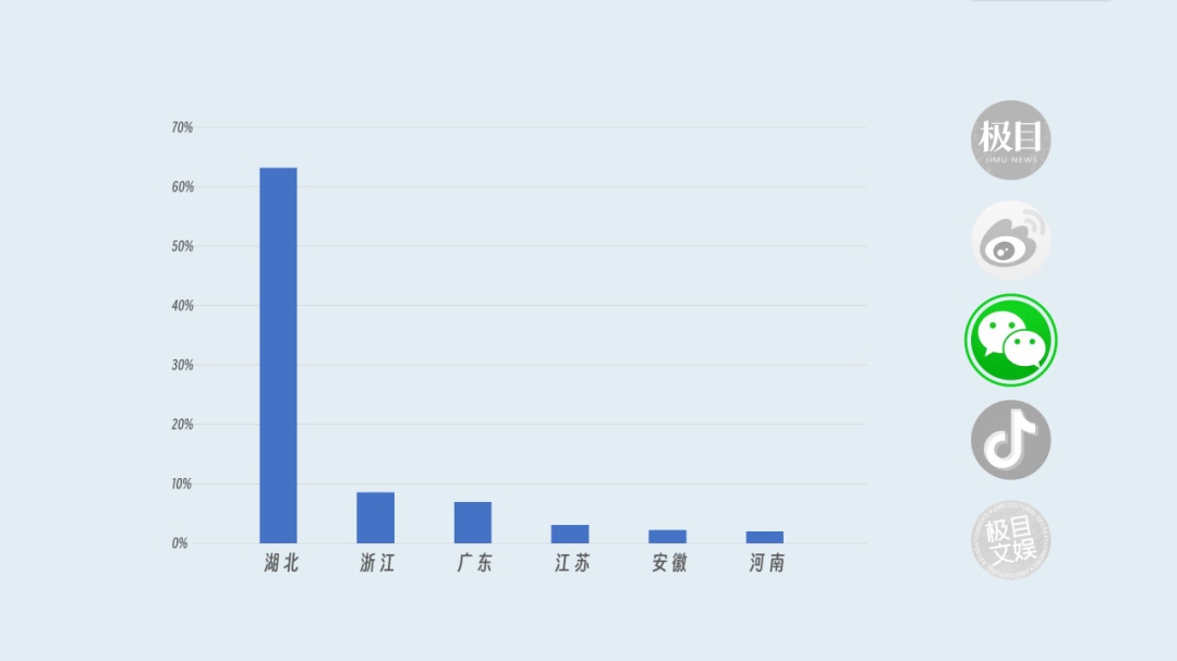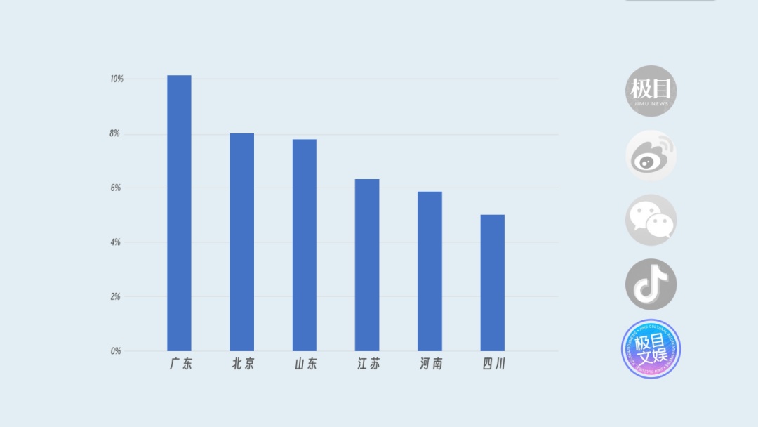 从用户地区分布来看呢,极目新闻全媒体矩阵用户覆盖全国,部分平台本地属性特点明显。就是说大部分还是来自咱们湖北省内的用户,除此之外,山东、浙江、广东、江苏粉丝占比排名普遍靠前。