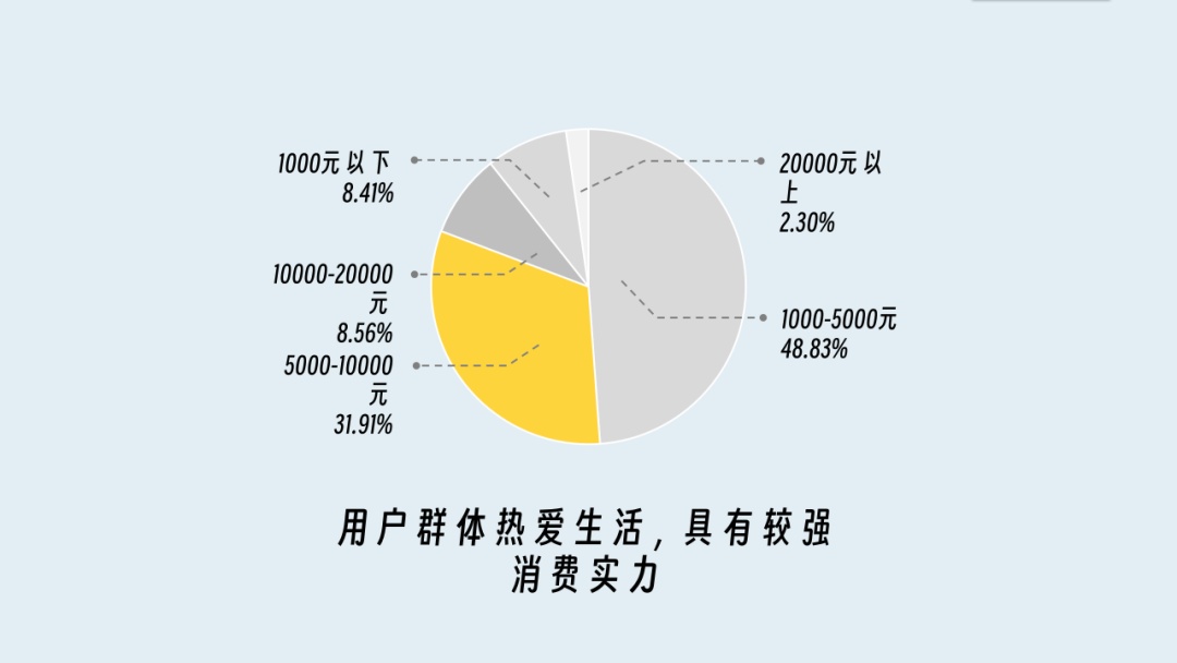 线上调查统计显示,除车贷、房贷、医疗、应急等大额支出项目外,31.91%的用户月均消费在5000-10000元。
