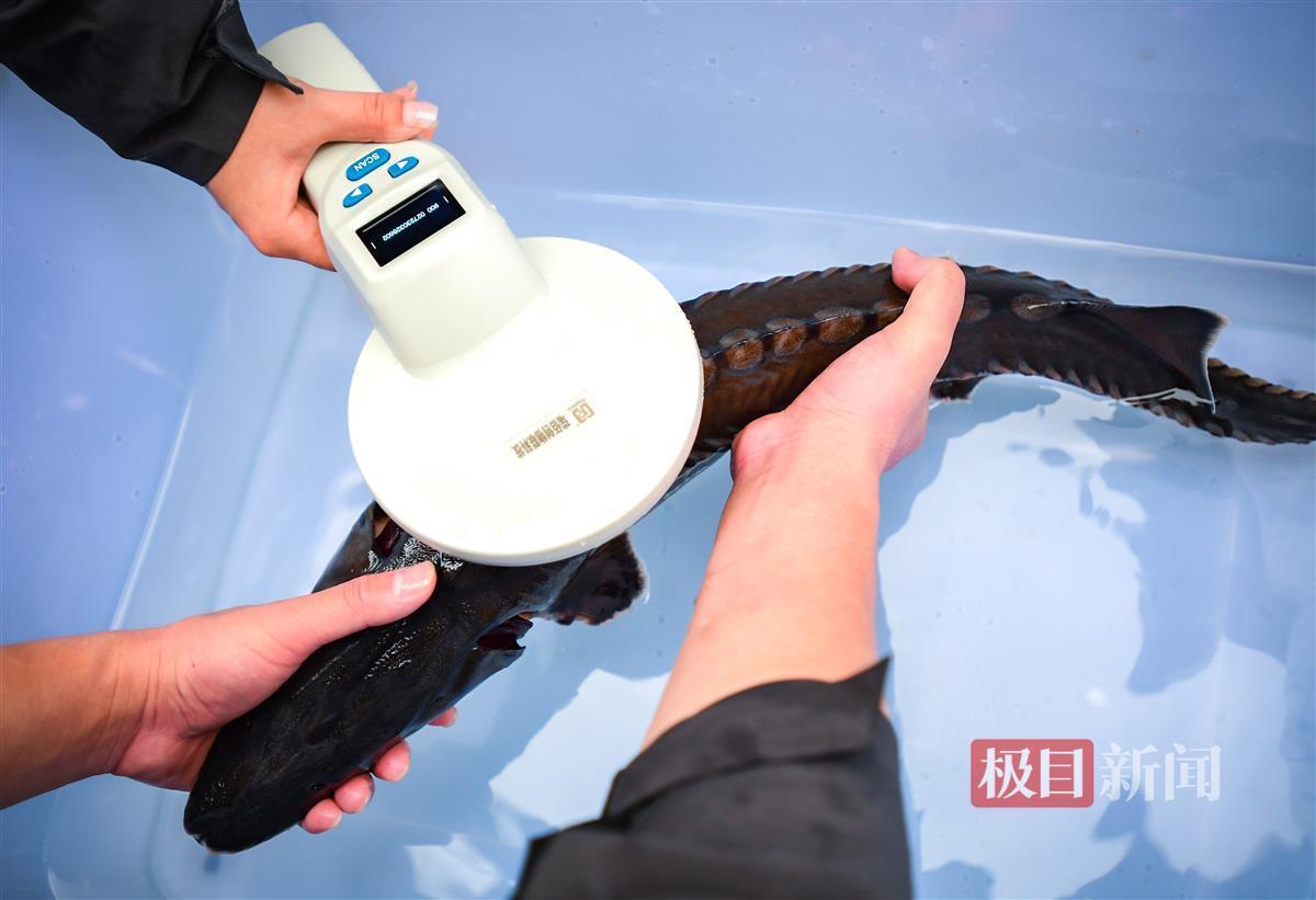 记者看到,现场工作人员还对数条中华鲟进行了现场打标,“900027230326602”,一个长约0.3厘米的PIT(无线射频识别)芯片,装在一个细细的针头上,植入到中华鲟背部的肌肉中。这些中华鲟就拥有一张相伴终生的“电子身份证”。