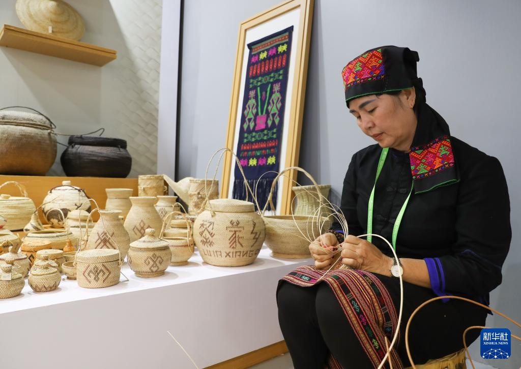 3月28日,黎族藤编非遗传承人在展览现场制作手工艺品。