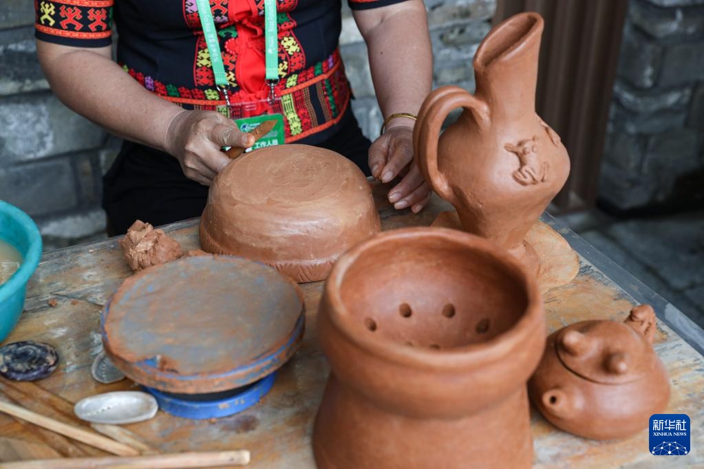 3月28日,黎陶非遗传承人在展览现场制作陶器。