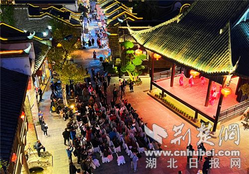 傍晚7点,湖北旅游名街莫愁村内人头攒动、格外热闹,民俗大戏台前围满了观众,一场充满特色的歌舞表演拉开了活动的序幕。