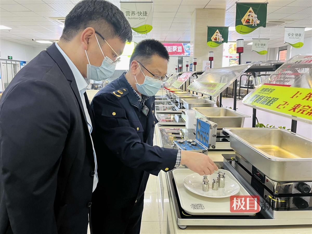 据介绍,该自选餐区域实施一菜一价,用餐者按需取材称重后,系统会自动显示总价格。极目新闻记者现场看到,每样菜品下方的电子屏上,均显示了具体价格。为了验证称重器具是否准确,执法人员将一个重量为200克的标准砝码放置在托盘上称重,屏幕显示“200克”。