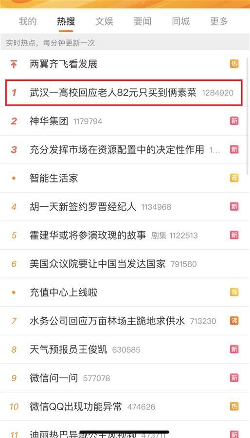 话题#武汉一高校回应老人82元只买到俩素菜#在登上热搜第一(图片来源:网络截图)