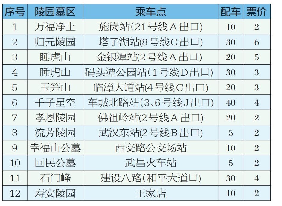 此外,市公交集团还将根据客流情况,适时开通川龙大道红寨村至汉口殡仪馆的摆渡车、王家湾至扁担山的摆渡车,确保以上地区市民的祭扫出行需求。在非祭扫专线运行时段,途经墓区的常规公交线路(如227、266、275、513、518、906路等)将保证运力充足,以满足市民错峰祭扫需求。这12条祭扫公交专线,不参与换乘优惠,免费证件无效。市民乘坐时,可投币(不享受折扣)或使用武汉通、支付宝、微信、银联卡购票,享受9折优惠。
