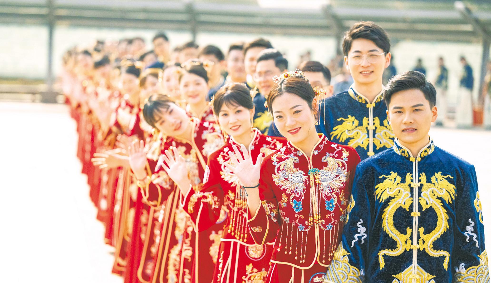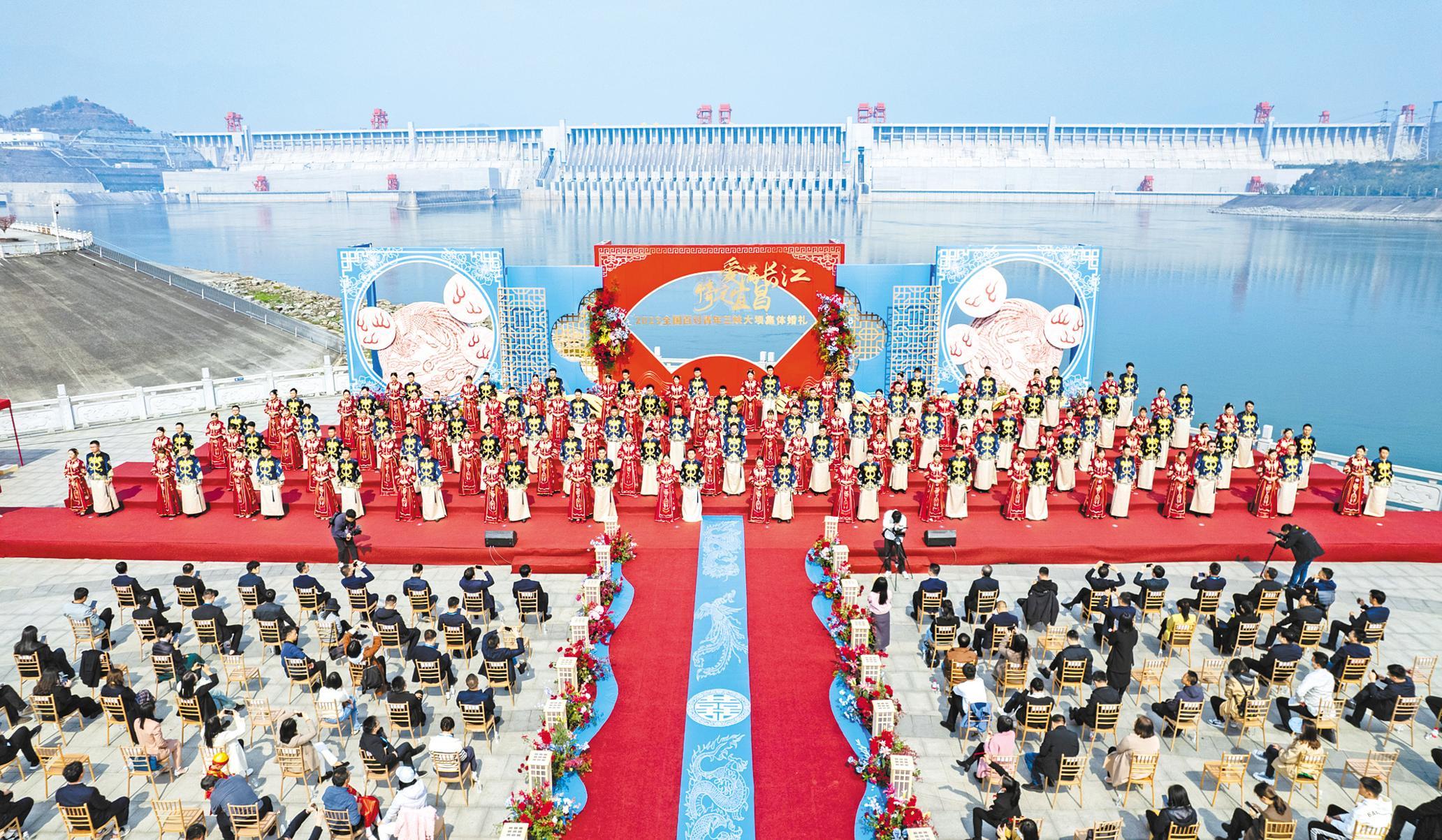 3月31日,“爱满长江 情定宜昌”2023全国70对青年三峡大坝集体婚礼,在三峡大坝截流纪念园礼成。来自全国11个省份的70对新人共同许下爱的青春誓言:传承好家风,引领新风尚,奋斗绽芳华。