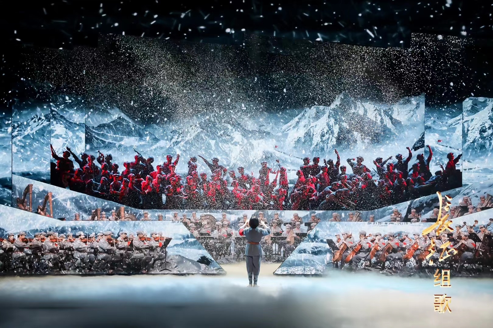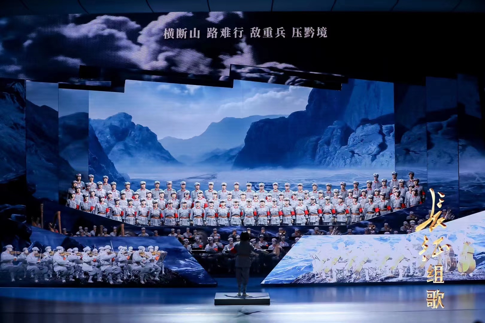 整场演出下来,实景与影像的虚实融合,视觉特效与音乐的高度契合,当代造型艺术与传统舞台美术的有机结合,形成了兴国版《长征组歌》的一大特色。