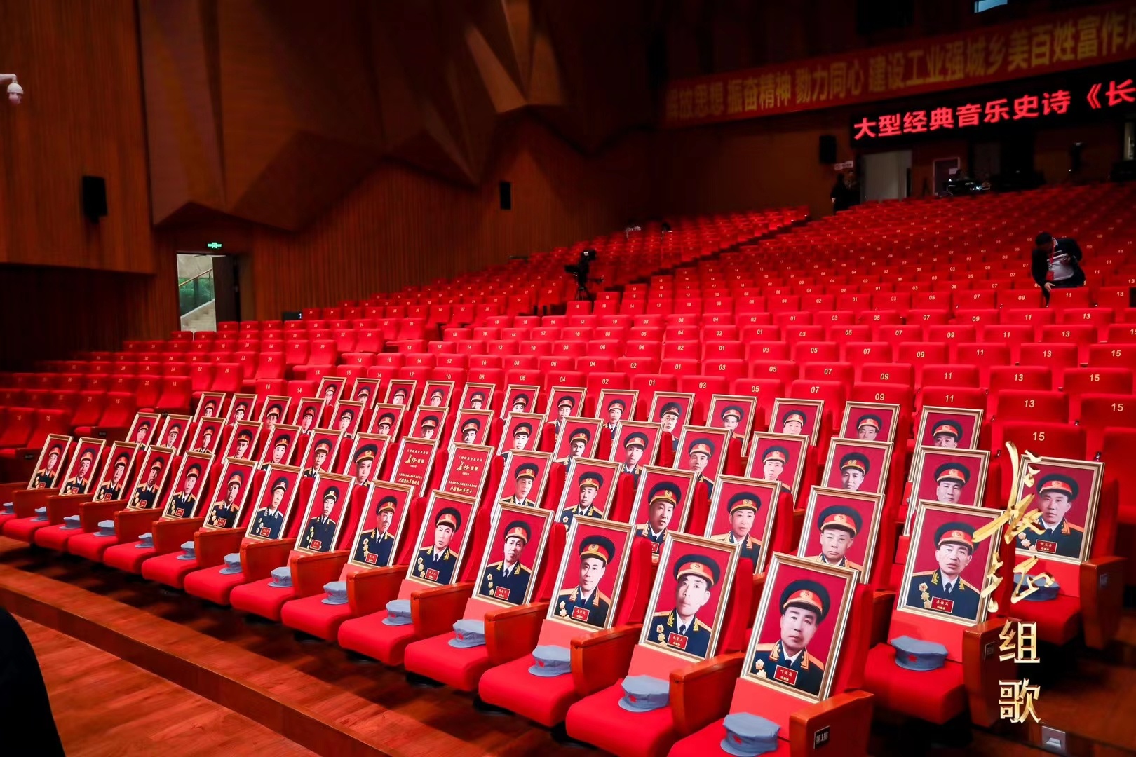 首演现场还特别设立了“兴国红军战士” “兴国红军烈士”以及“兴国籍 56 位开国将军”正装照席位,旨在用歌声告慰先烈英灵,致敬革命先辈!