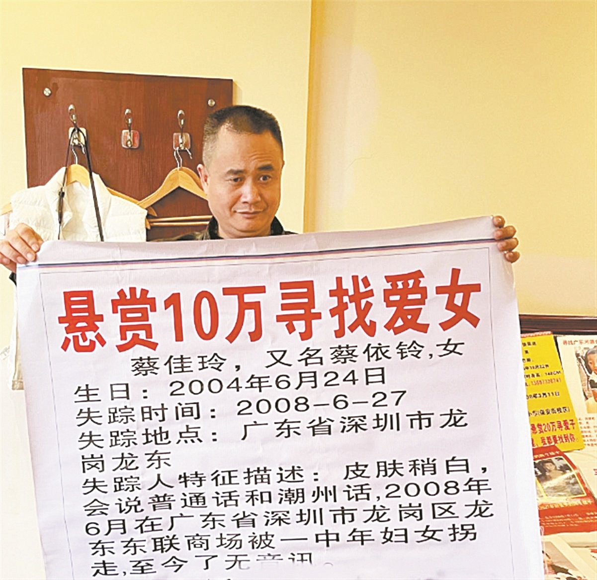 2008年,蔡兴全4岁的小女儿蔡佳玲在深圳一个商场被人拐走,一家人踏上了痛苦又漫长的寻亲之路。今年3月,在深圳警方的帮助下,蔡兴全终于在四川找到了小女儿,一家人在深圳团圆。