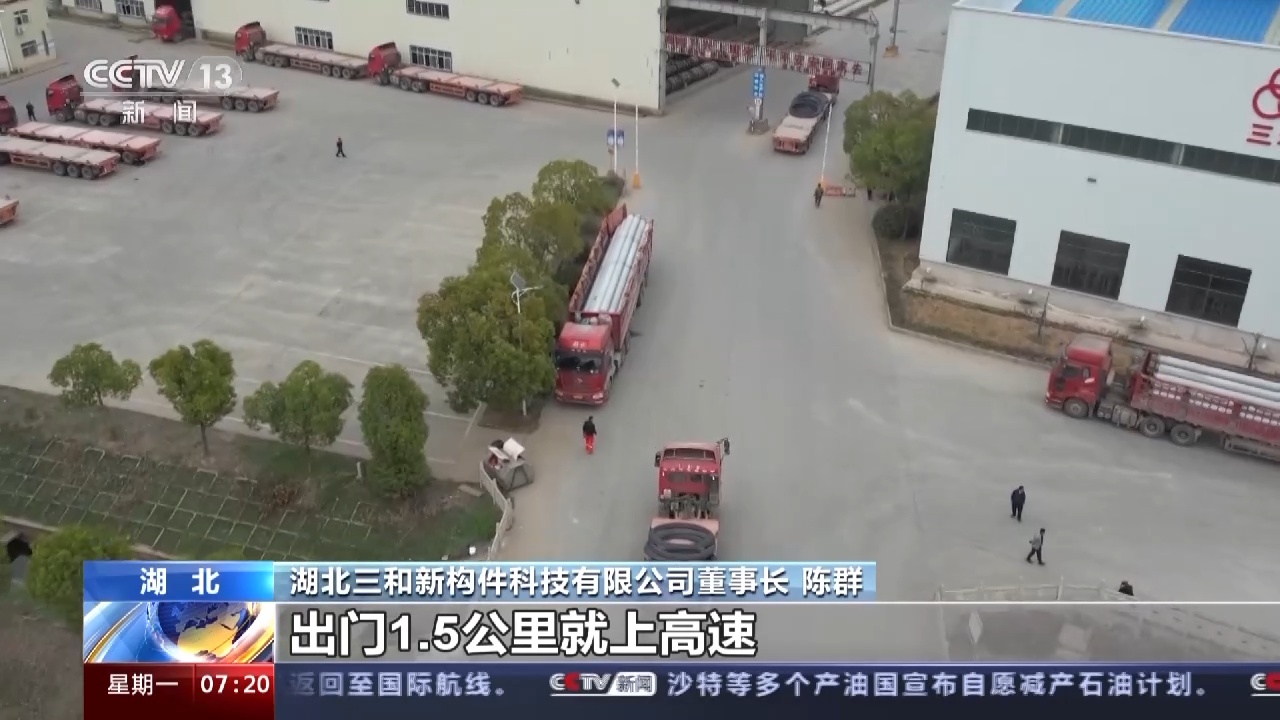 湖北三和新构件科技有限公司董事长 陈群:原来只能在一百到两百公里范围里面去选择供应的原材料,现在可以从一千多公里外的江苏、浙江等地选择,每吨钢材可以降低70到150块钱的成本。