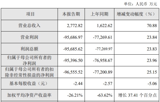 迈威生物2022年度业绩快报公告显示,2022年,公司实现营业总收入2,772.82万元,同比增长70.88%;归属于母公司所有者的净利润为-95,396.50万元,亏损同比增加23.96%;归属于母公司所有者的扣除非经常性损益的净利润-96,555.52万元,亏损同比增加25.15%。